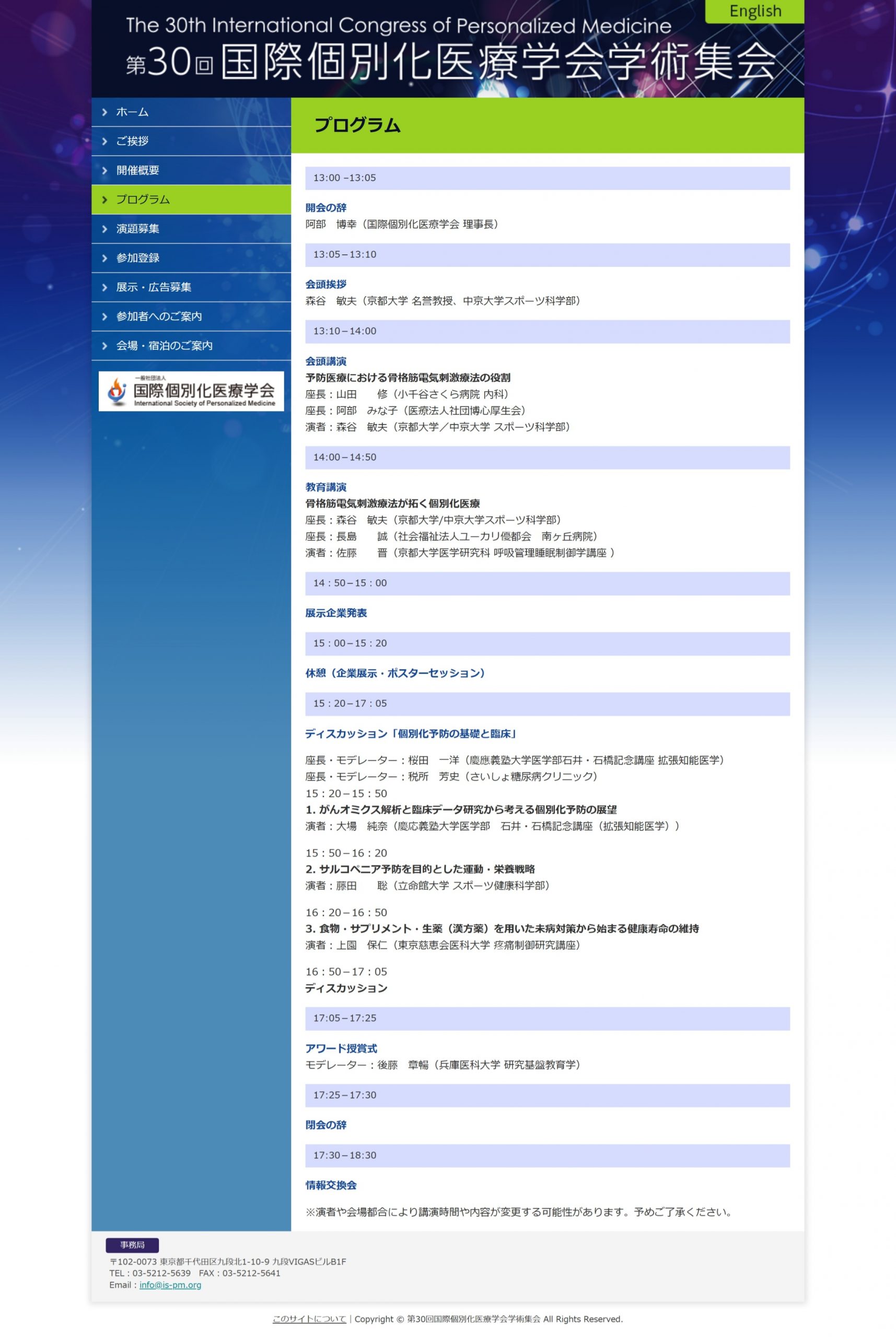 第30回国際個別化医療学会学術集会 [2025.12.07] 本日、神田で開催された「第30回国際個別化医療学会学術集会」に参加しました。 京都大学 名誉教授・中京大学スポーツ科学部 森谷 敏夫会長のもと、「次世代の予防医療:Thrive, not just survive」をテーマに幅広い分野から最先端のお話しを聞くことができ、とても勉強になる1日となりました。 前の記事へ次の記事へ
